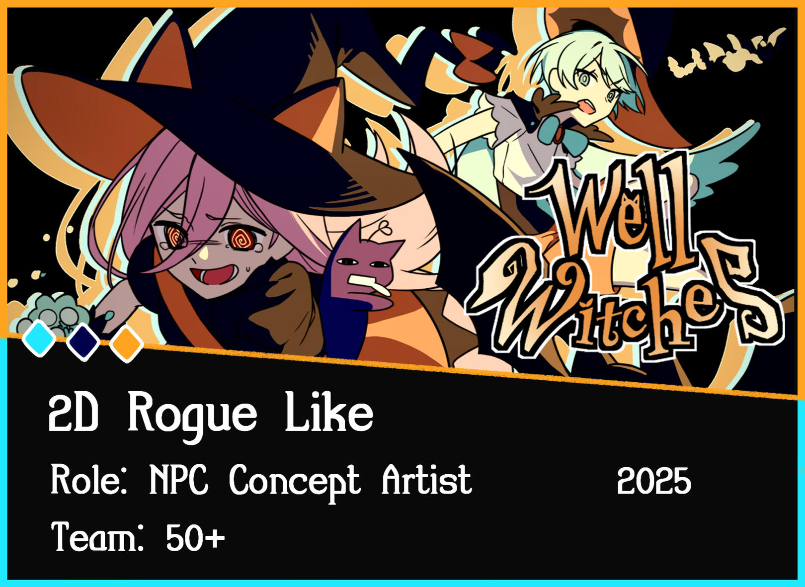 Because the game is Halloween themed and the main Characters are witches, it only made sense to also incorporate witch hats into almost all of the early concepts. Not only does it match the theme, but It also adds a bit of charm to the designs.
