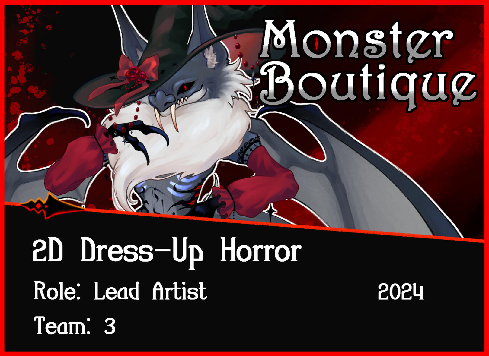 Monster Boutique is a game Prototype that I worked on in a group of 3 during my time at UCSC. I was the lead artist of the group, creating both concepts & finalized assets of the main Monster, including accessories and UI designs.The original idea started as a more basic horror game, but the idea eventually changed into a dress-up game with a gothic horror theme.