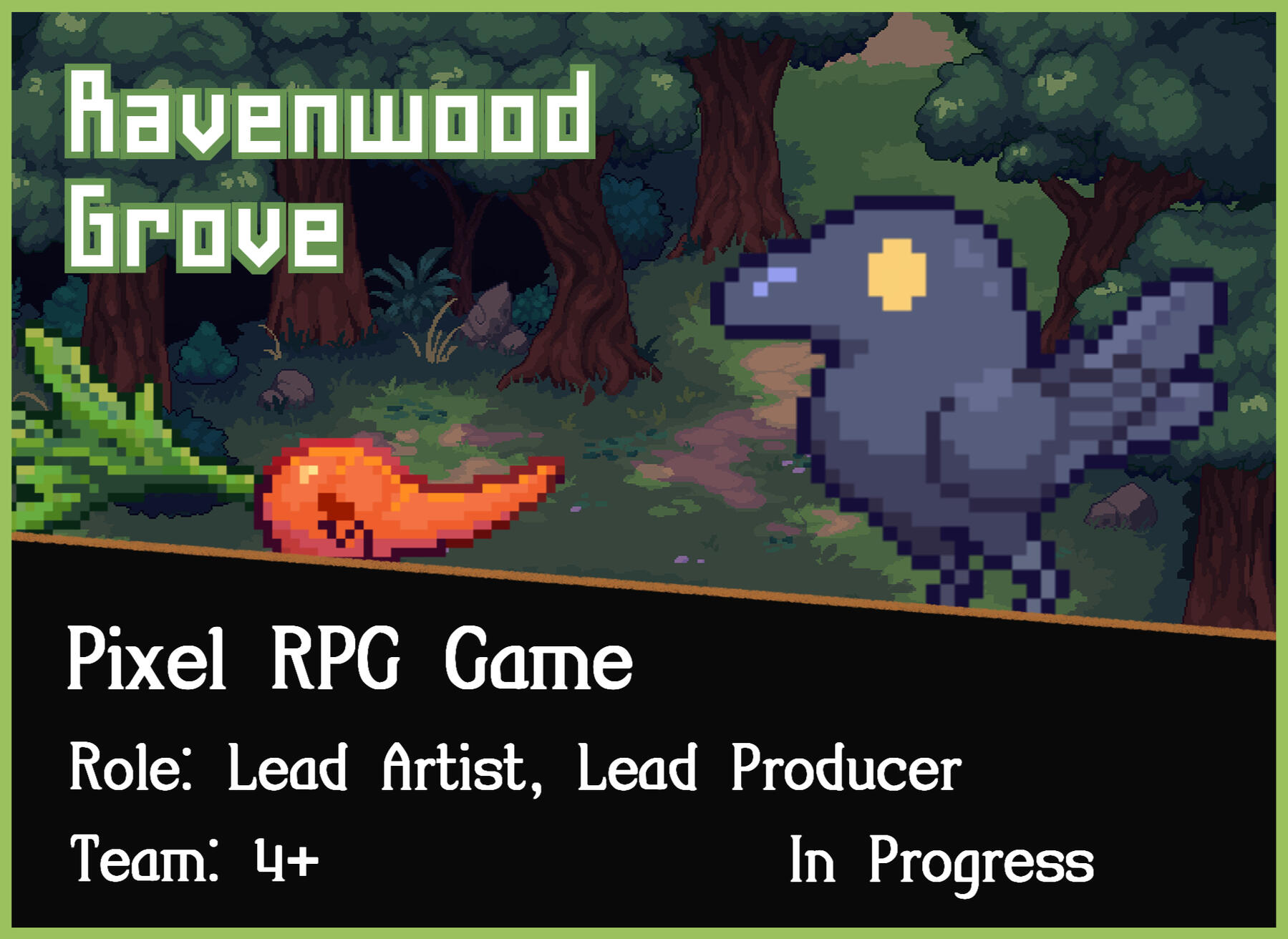 Ravenwood Grove is currently in development and is my current capstone as a UCSC Game Design student. All art assets are created by me.