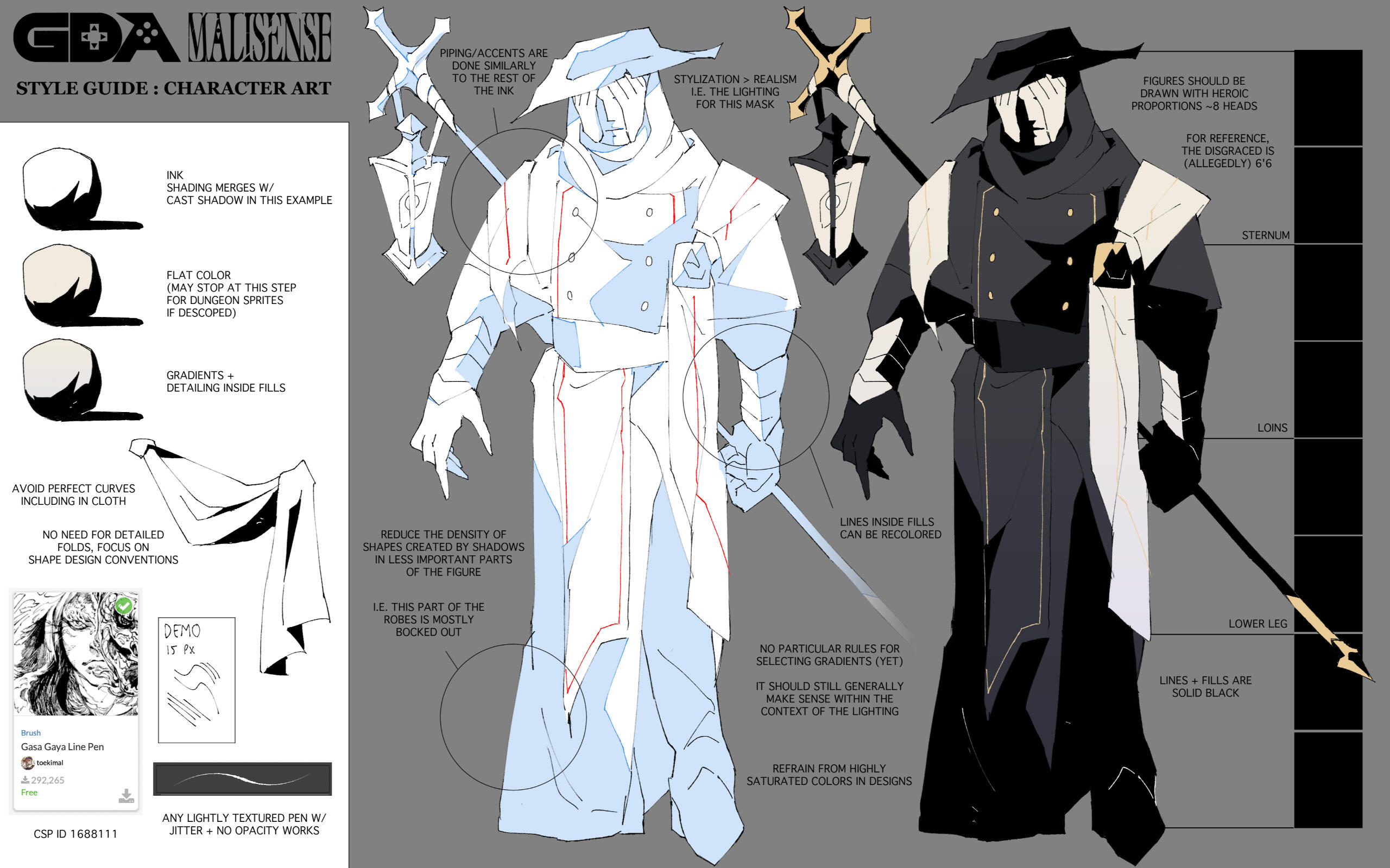 Displayed is the style guide that the art department was given in order to guide us and achieve the desired art direction throughout this project.The main takeaways are utilizing the flat colors to create dramatic, but intentional solid shading. Highly saturated colors were to be used sparingly and with intent. Sharp, angular shapes and lines were favored over round ones in order to fit the dark, gothic horror theme of the game.