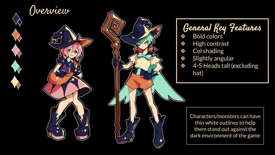 Displayed is the style guide that the art department was given in order to guide us and achieve the desired art direction throughout this project.As seen in the image, the main objective is to use bold and saturated colors alongside contrasting colors in order to create a compelling and striking palette. When it comes to angles, lineart should be balanced; not too sharp, but not too round (with some exceptions).