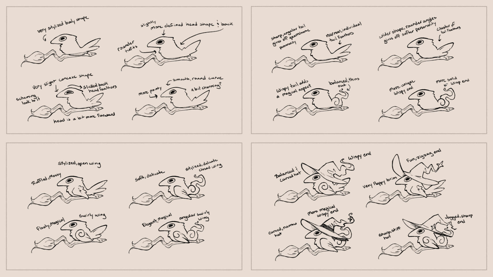 Focused Design Explorations; Body Shape, Tail Design, Wing Design, & Hat Concepts
